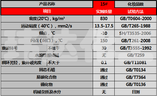 15號(hào)化妝級(jí)白油是采用加氫原料經(jīng)過(guò)超深度精制后得到的白色油。油品質(zhì)量?jī)?yōu)質(zhì),符合國(guó)際標(biāo)準(zhǔn). |